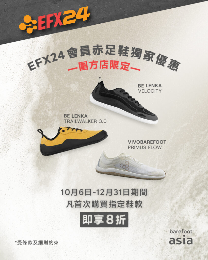 EFX24 members enjoy 20% OFF selected barefoot shoes at barefoot asia (The Wai branch)!
